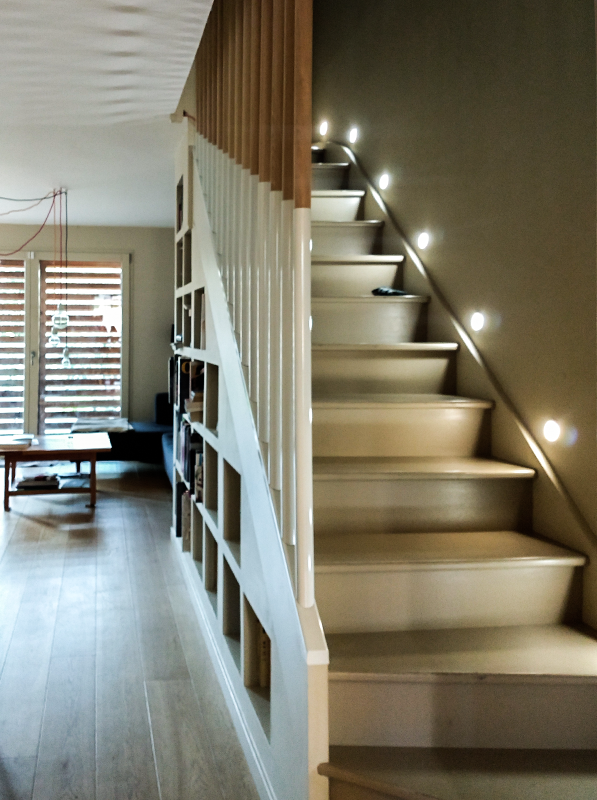 R+1 : Garde corps en rond de hêtre huilé et tube d’acier laqué, cube en aluminium plié laqué et contreplaqué. Niche de lecture en contreplaqué cintrable